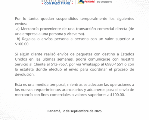 Si algún cliente realizó envíos de paquetes con destino a Estados Unidos en las últimas semanas, podrá comunicarse con nuestro Servicio al Cliente al 512-7657, por vía Whatsapp al 6980-1551 o con la estafeta donde efectuó el envío para coordinar el proceso de devolución.