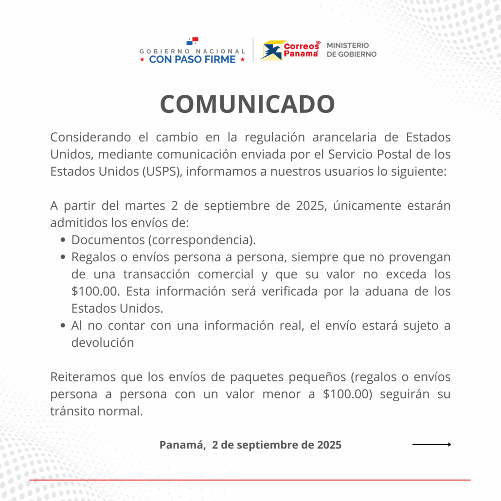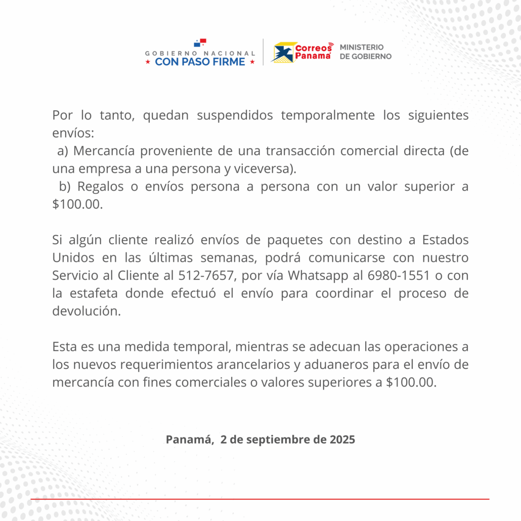 Si algún cliente realizó envíos de paquetes con destino a Estados Unidos en las últimas semanas, podrá comunicarse con nuestro Servicio al Cliente al 512-7657, por vía Whatsapp al 6980-1551 o con la estafeta donde efectuó el envío para coordinar el proceso de devolución.